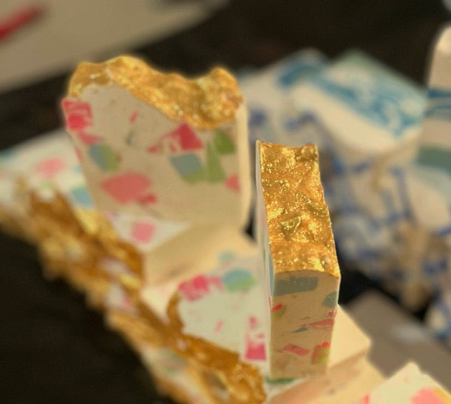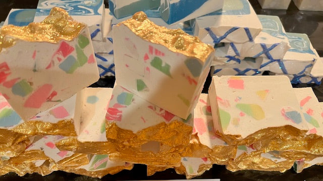 Ingredients: Purified water, saponified oils of organic olive, organic coconut, palm, shea butter, select essential and/or fragrance oils, mica, oxides